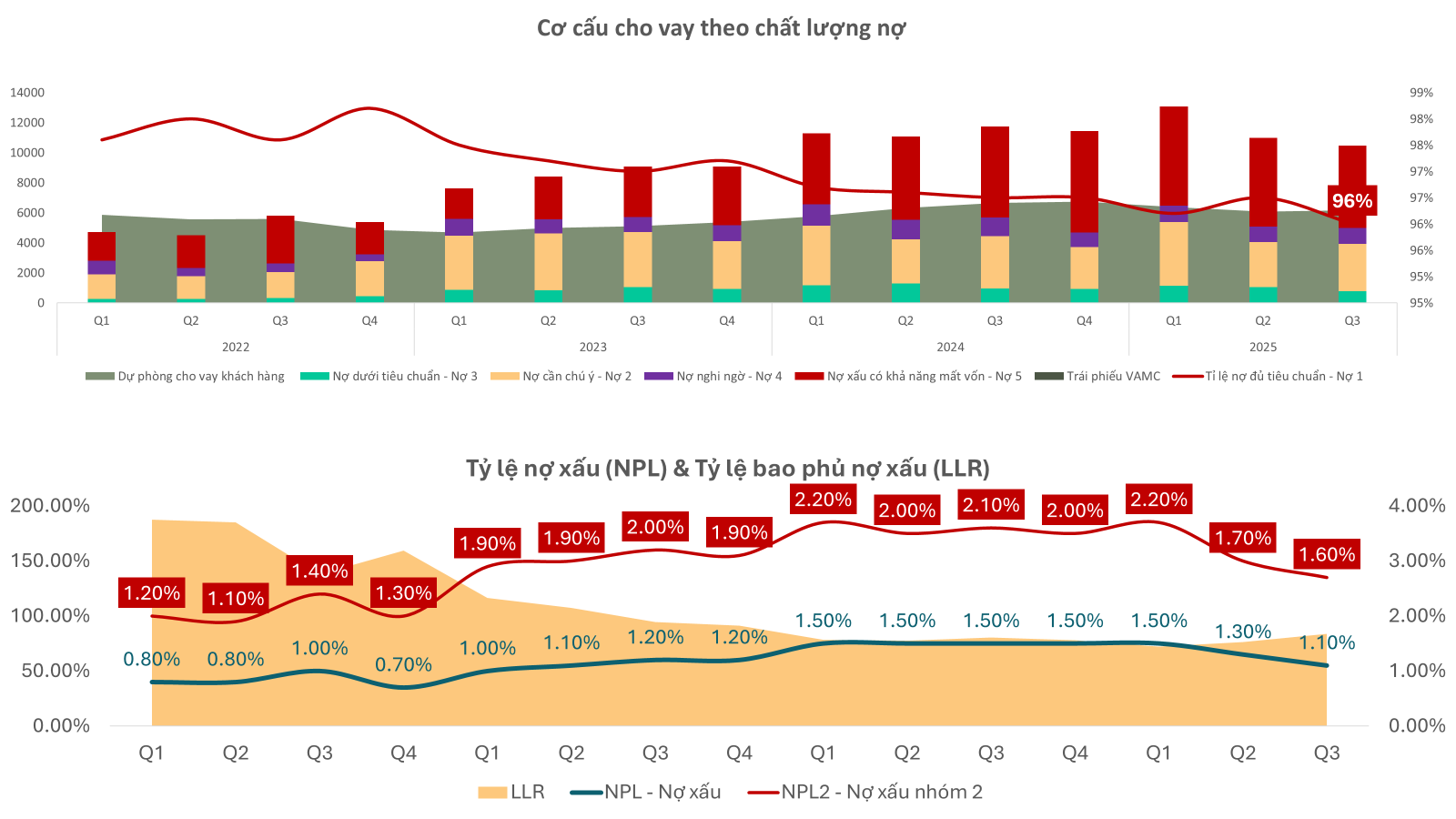 Mặc dù lợi nhuận giảm, nhưng chất lượng nợ của ACB vẫn duy trì ổn định. Nợ nhóm 1 giảm nhẹ, trong khi các nợ quá hạn thuộc nhóm 3-5 vẫn trong xu hướng giảm mạnh, thể hiện ngân hàng đã thực hiện chiến lược kiểm soát rủi ro chặt chẽ. Tỷ lệ bao phủ nợ xấu đạt 84%, cao hơn nhiều so với các quý trước, cho thấy khả năng dự phòng tốt và hạn chế rủi ro phát sinh.