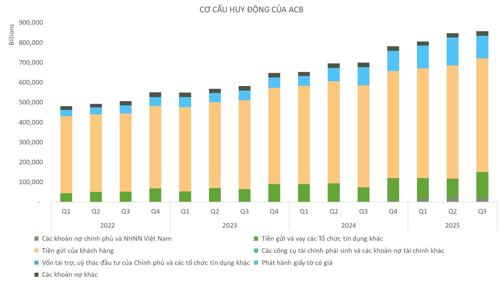 Ngoài thu từ hoạt động chính, ACB còn có các nguồn thu khác như dịch vụ ngân hàng, hoạt động ngoại hối, vàng và chứng khoán, nhưng mức tăng trưởng của các nguồn này không đủ để bù đắp cho sự suy giảm của thu nhập chính. Bên cạnh đó, cấu trúc huy động vốn của ngân hàng cũng có sự thay đổi theo hướng tăng tỷ trọng tiền gửi khách hàng, giúp giảm chi phí vốn, dù mức lợi nhuận biên vẫn đang chịu áp lực từ việc chi phí huy động đầu vào tăng mạnh hơn lợi suất cho vay.