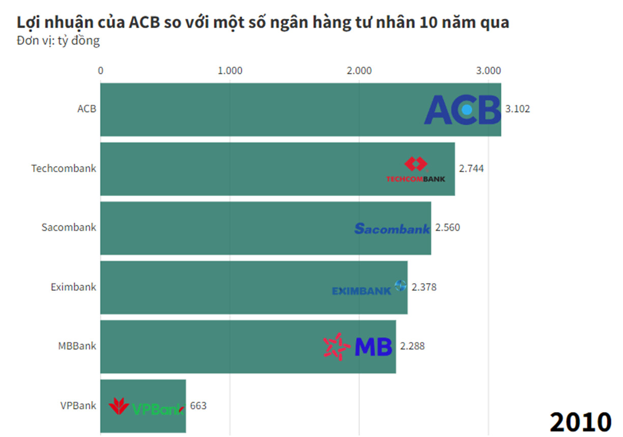 Sau hơn 10 năm vượt qua khủng hoảng và lấy lại vị thế, hiện nay ACB đã trở lại top 4 ngân hàng tư nhân đứng đầu thị trường nhưng vẫn phải chấp nhận một khoảng cách khá xa để đuổi kịp người dẫn đầu