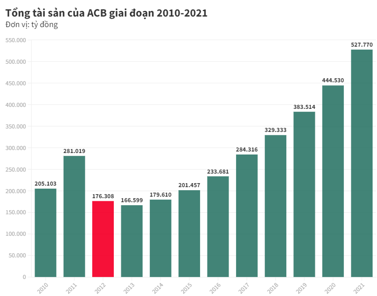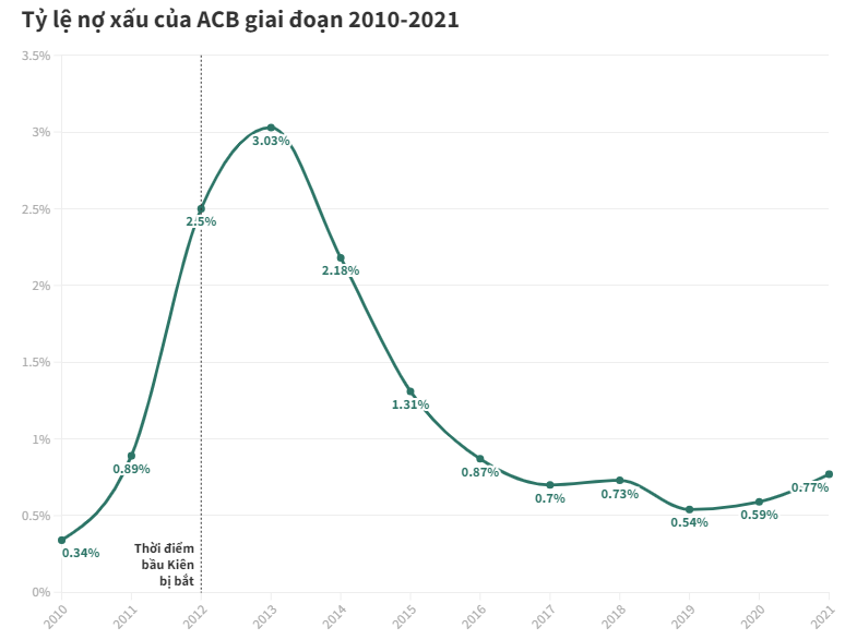 Đang trong đà tăng trưởng vượt trội như vậy, thì đến tháng 8/2012. Bầu Kiên bị bắt, điều này khiến tổng tài sản của ACB sụt giảm gần 40% chỉ còn hơn 176.000 tỷ đồng