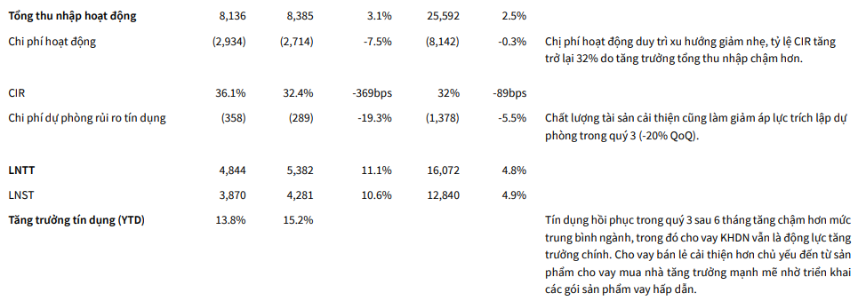 Tỷ lệ nợ xấu (NPL): Giảm mạnh từ mức đỉnh 1,48% (Q1/2025) xuống chỉ còn 1,09% vào cuối Quý 3. Đây là mức thấp nhất trong nhóm ngân hàng niêm yết.