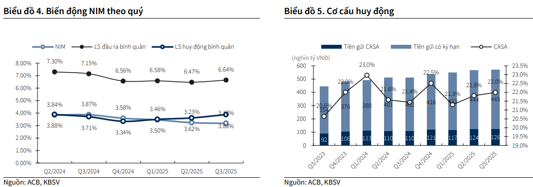 Một điểm trừ trong ngắn hạn là biên lãi ròng (NIM) của ACB chịu áp lực giảm về mức 3,18% . Nguyên nhân do chi phí vốn (COF) tăng nhanh hơn lợi suất tài sản khi lãi suất huy động đầu vào tăng nhẹ. Dự báo NIM sẽ chỉ phục hồi nhẹ trong năm 2026.