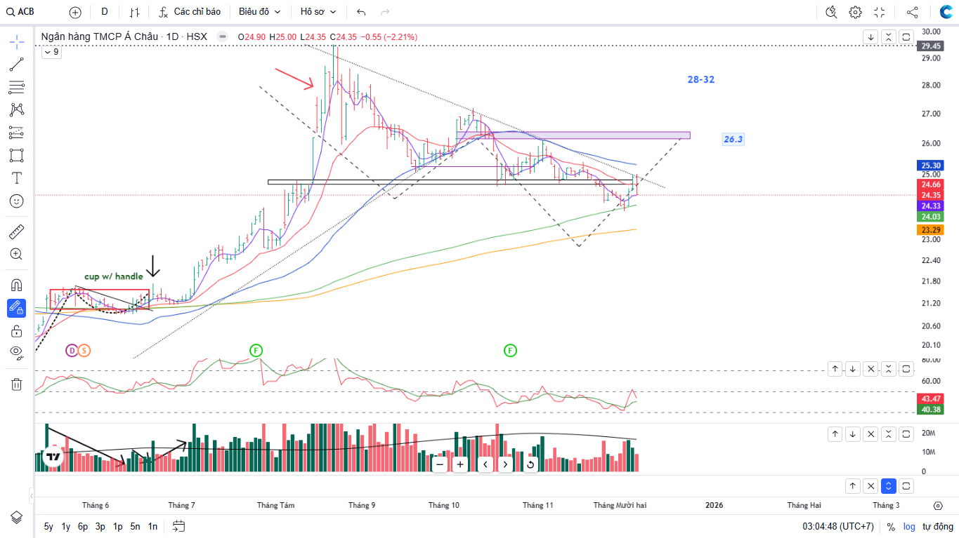 Với lượng cung dày đặc phía trên, ACB có thể cần tích lũy thêm, nhưng đây được xem là cổ phiếu tiềm năng để thay thế các “leader” cũ dẫn dắt dòng ngân hàng trong nhịp tăng tới.