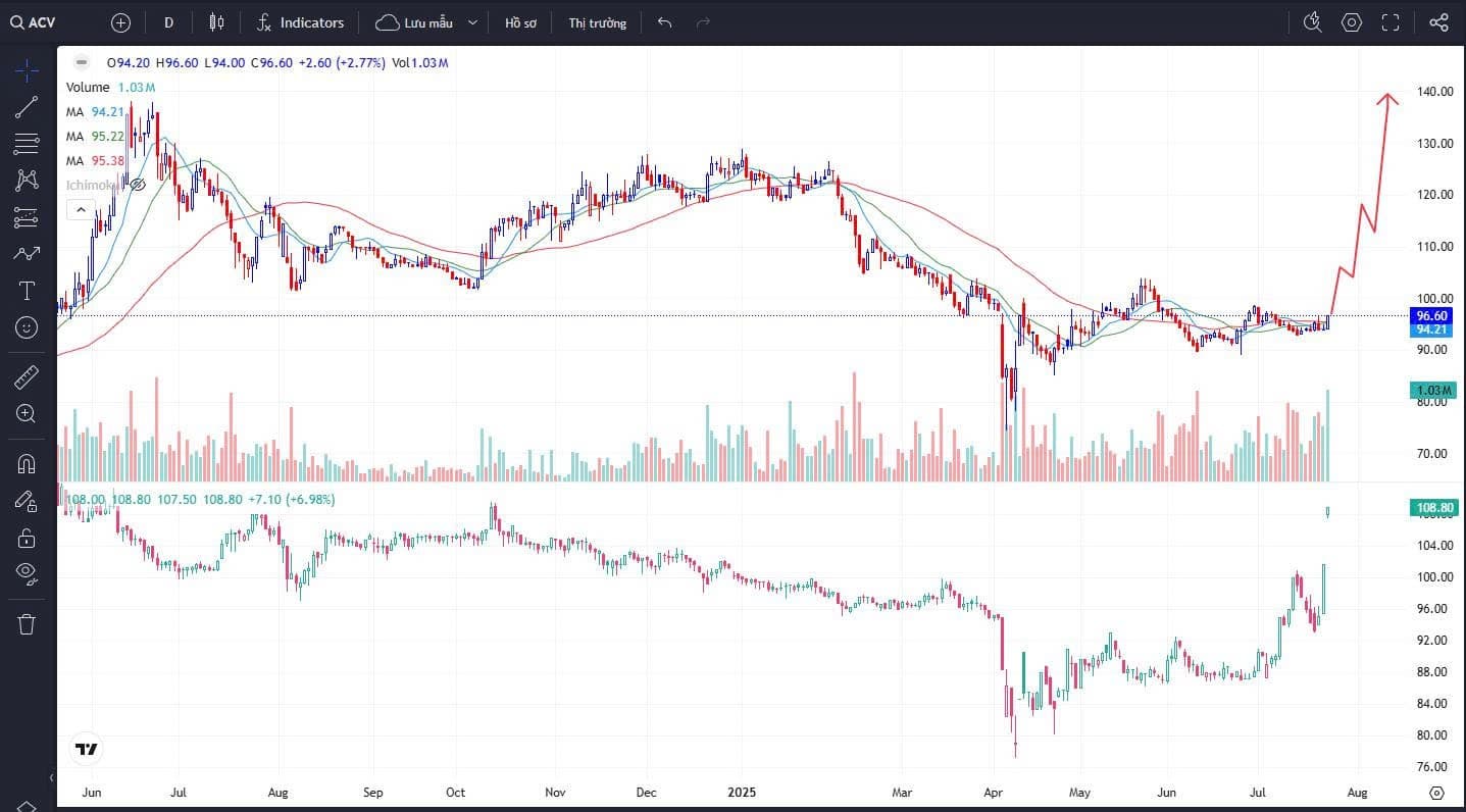ACV dòng tiền lớn vào vùng đáy đã xác nhận, điểm mua ACV 96x. Mục tiêu 140