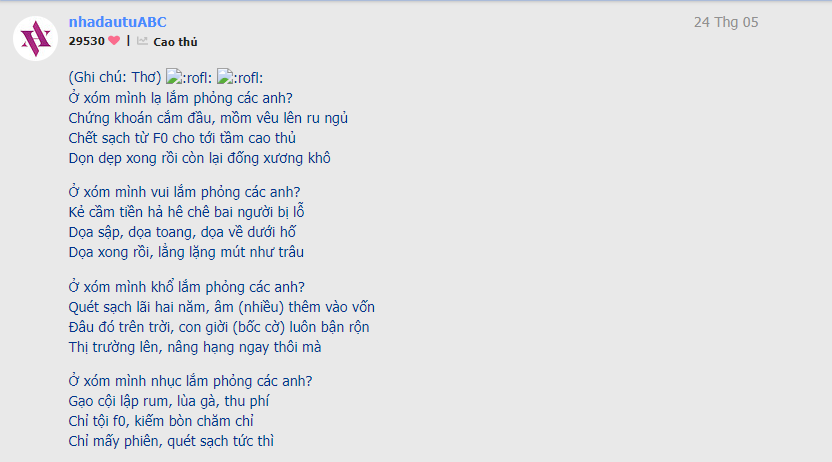 Chào thài @TruongTamGia , chào bác đạo @An_Danh , chào bác queen @win-win , chào gà hư hỏng @Ga_con_78 , chào bác gió lào @degiocuondi , chào bác hứng @Quanghung2507 , chào bác cong @nhadautuABC , chào bác chi @Harchi , chào bác thầy cúng @lancevancedance16 , chào bác chẵn @2468 , chào bác đường nhựa @con_duong_pro , chào bác trường @Quanvantruong01 , chào bác bắp @PAPLO1002 , chào bác điêu thuyền @Diaochanno1 , chào bác sói @CityHunter , chào bác đểu @deutscher , chào bác lúa @Value77 , chào bác @IDCer , bác mấu tèo @Ks.Langthang , chào bác @dht, chào bác @Lekien1299, chào bác @Hoang_Dung_MAS , chào bác rét @AresKingStock , chào bác @Fearless , chào bác @Tinhtuongtueminh , chào bác @junjun , chào bác đẹp @DANANH, chào bác @Tranleminh-1975 , chào bác Ri @Paris , chào bác @Gamof0, chào bác mày @May86 , chào bác @Minhanh-minhanh , chào bác @ChiPheo , chào bác @NgocKhoi79 , chào bác @Ngoc_Anh1 , chào bác @Linhht và chào các bác khác ![]()