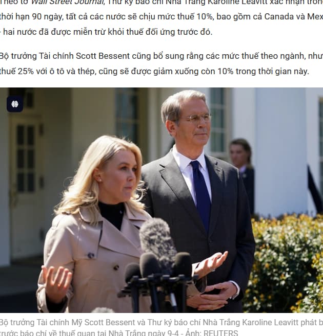 Nên nhớ, quyết định hiện thời của phía Mỹ chỉ là hoãn thuế 90 ngày, chứ ko phải là xóa bỏ hoàn toàn và nước mình vẫn phải chịu thêm 10% thuế chứ ko phải giữ nguyên như trước.