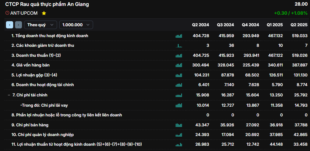 Nửa đầu năm 2025, Antesco ghi nhận doanh thu 946,5 tỷ đồng và lợi nhuận trước thuế 77,5 tỷ đồng, tăng lần lượt 35,5% và 81% so với cùng kỳ, hoàn thành 61% kế hoạch doanh thu và 91% kế hoạch lợi nhuận năm. Trên thị trường, cổ phiếu ANT chốt phiên 3/10 ở mức 31.900 đồng/cp – cao nhất lịch sử, tăng gần gấp đôi so với cùng kỳ năm ngoái và gấp tám lần so với cuối năm 2022.