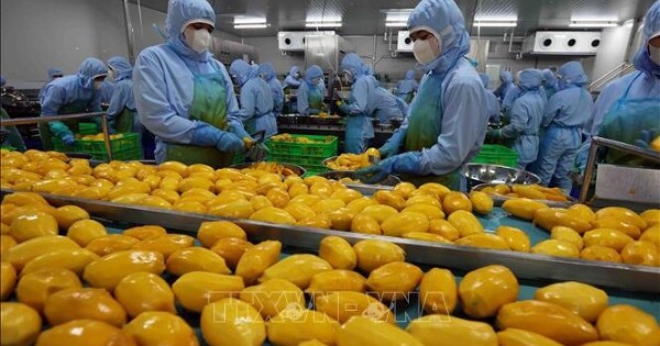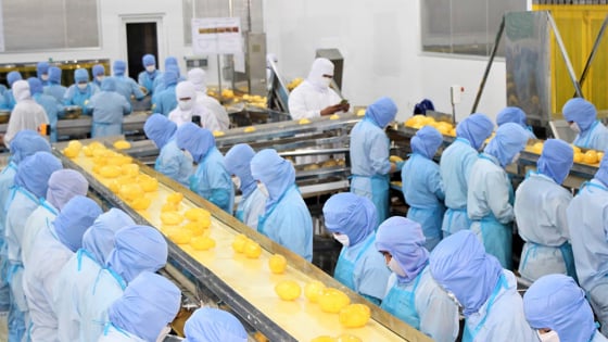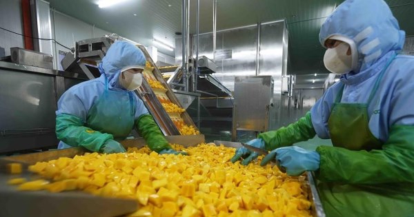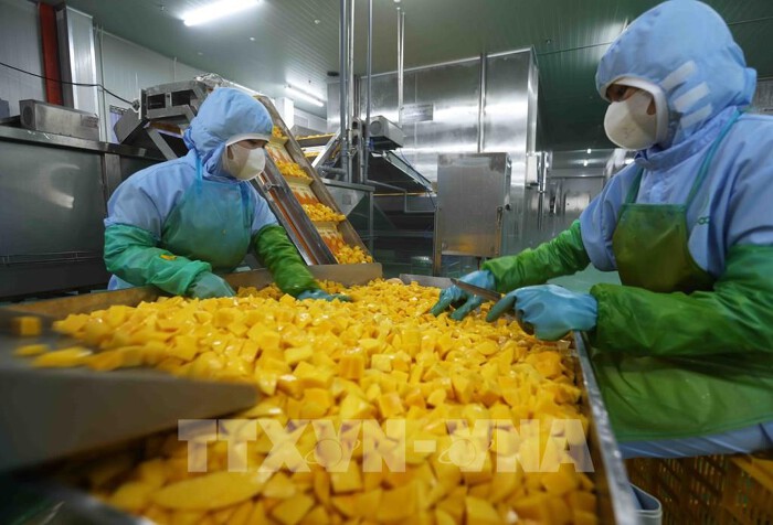 Dây chuyền chế biến sản phẩm xoài xuất khẩu sang thị trường Mỹ, châu Âu, Hàn Quốc, Nhật Bản ở nhà máy của Công ty CP Rau quả An Giang (tỉnh Lâm Đồng)