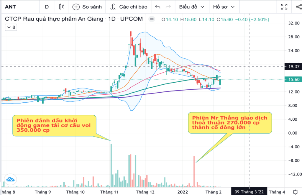 Đầu năm 2020 SCIC bán đấu giá 49.04 % phần vốn nhà nước tại ANT với giá trung bình 20.500đ/cp. Tới phiên bùng nổ ngày 02/11/2021 có 350.000 cp khớp lệnh giá 13, các phiên sau đó khớp lệnh khoảng 50 – 70.000 cp, Từ 13 đến 17/1/2022 có nhiều giao dịch trao tay ngay trên sàn với khối lượng lớn, cuối ngày công bố thông tin trở thành cổ đông lớn 270.000 cp của ông Phạm Ngô Quốc Thắng (chủ yếu là mua ngày 13/1/2022 khối lượng giao dịch đột biến 243.200 cổ phiếu với giá khớp lệnh trung bình 16.2). Nếu cộng với 2 triệu cp phát hành thêm ngày 1/11/2021 cho nhóm cổ đông chiến lược thì có thể áng chừng nhóm cổ đông lớn đã nắm gần hết cp của công ty giá trung bình 16.000đ/cp trở lên.