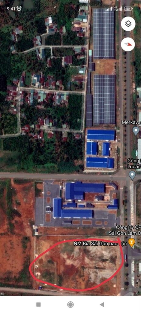 Ảnh google map Nhà máy B’laofood, vùng khoanh đỏ là giai đoạn 2 chưa xây dựng. Giai đoạn 1 đã xong phần khung, đang lắp thiết bị máy móc dây chuyền.