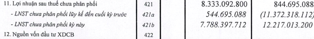 Lợi nhuận sau thuế chưa phân phối tại thời điểm cuối quý 3/2021 là 8,3 tỷ, với 8 triệu cp hiện tại (gồm 6 triệu cổ phiếu cũ và 2 triệu cổ phiếu phát hành thêm quý 4/2021), chưa tính lợi nhuận quý 4/2021vẫn đủ chia cổ tức của năm 2021 là 1.000 đ/cp.