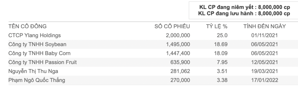 Cổ đông lớn thuộc diện phải công bố thông tin khi giao dịch chiếm tới 76,6% cổ phần (trong đó 2 tr cổ phiếu mới phát hành thêm cho CTCP Ylang Holdings (tỷ lệ 25%) hạn chế giao dịch 1 năm). Theo bảng cơ cấu cổ đông trên, bên ngoài chỉ có 23,4% tương đương 1,872 triệu cổ phiếu. Tuy nhiên, nếu loại trừ một số cổ đông đứng sau khối cổ đông trên thì ước tính lượng trôi nổi bên ngoài chỉ tầm 500 – 700k cp.