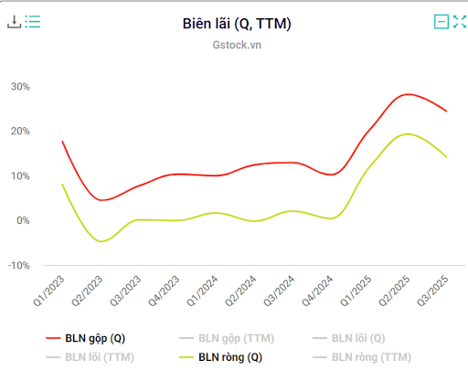 Vua cá tra ANV vừa công bố báo cáo Q3/25 với con số tăng trưởng khá ấn tượng. Trong kì, doanh thu thuần ghi nhận 2.000 tỷ đồng, tăng 49% so với cùng kỳ. Lãi gộp tăng mạnh gần gấp 3 lần cùng kỳ, ghi nhận 487 tỷ đồng, nên biên lãi ghi nhận 24,4% - một con số rất ấn tượng sau khi ANV tìm ra công thức thành công. Lợi nhuận ròng đạt 283 tỷ đồng, tăng mạnh 916% yoy. Biên lãi ròng đạt 14,2% - cao hơn so với cùng kì nhưng thấp hơn so với Q2/25. Đây là mức đỉnh mới theo quý xét về cả doanh thu lẫn lợi nhuận. Theo ban lãnh đạo, kinh tế thị trường tích cực đã tạo điều kiện thuận lợi cho hoạt động SXKD của doanh nghiệp.