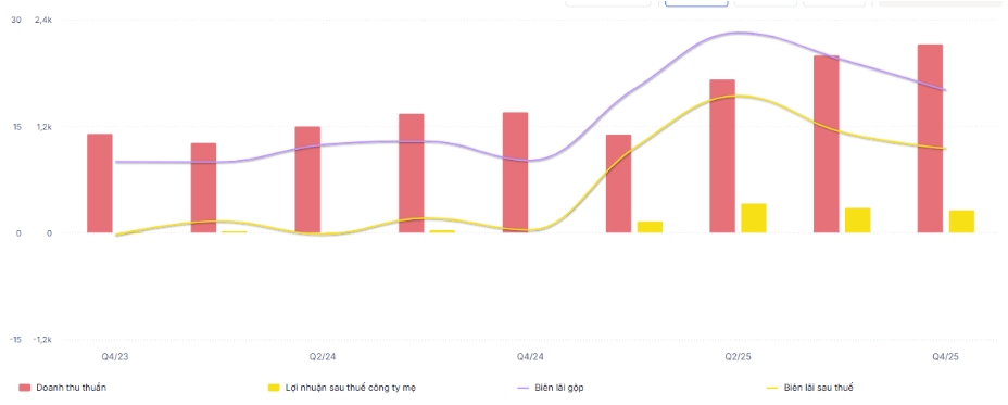 Có thể nói 2025 là năm vô cùng thành công của ANV khi kết quả kinh doanh tăng trưởng vô cùng mạnh mẽ. Cụ thể, KQKD Q4/25 ghi nhận con số vô cùng ấn tượng: Doanh thu thuần đạt 2.119 tỷ đồng (+55,7% yoy) nhờ sản lượng và giá bán đều tăng mạnh so với cùng kỳ. Bóc tách doanh thu của ANV như sau: