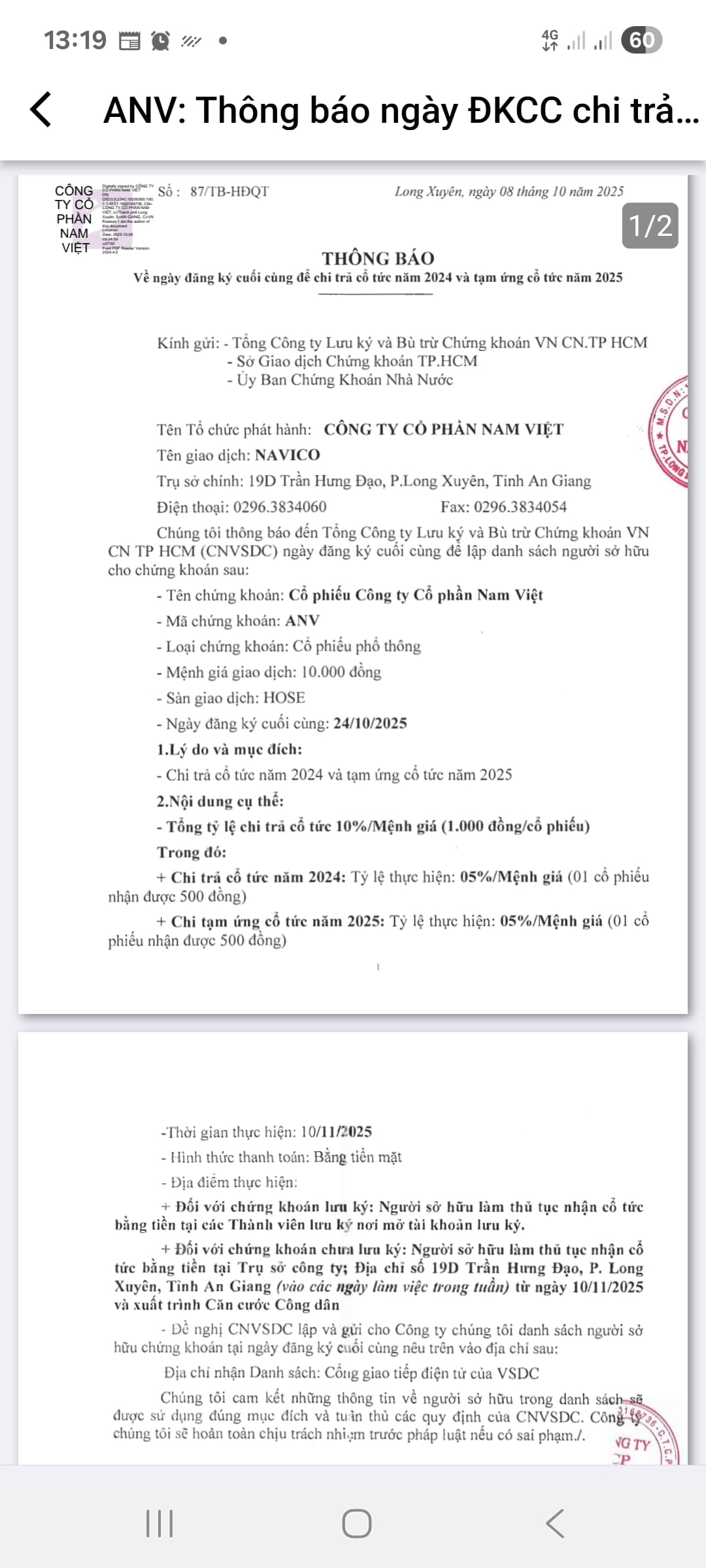 CTCP Nam Việt (ANV) vừa thông qua kế hoạch chi khoảng 266 tỷ đồng để trả cổ tức tiền mặt tổng tỷ lệ 10% (tương đương 1.000 đồng/cp), gồm 5% cho năm 2024 và 5% tạm ứng năm 2025. Nguồn vốn chi trả được trích từ 601 tỷ đồng lợi nhuận sau thuế chưa phân phối tính đến 30/6/2025. Ngày đăng ký cuối cùng nhận cổ tức là 24/10, ngày giao dịch không hưởng quyền 23/10, và thanh toán dự kiến 10/11/2025. Với hơn 266 triệu cổ phiếu lưu hành, ANV sẽ hoàn tất toàn bộ kế hoạch cổ tức 2025 sau đợt chi này.