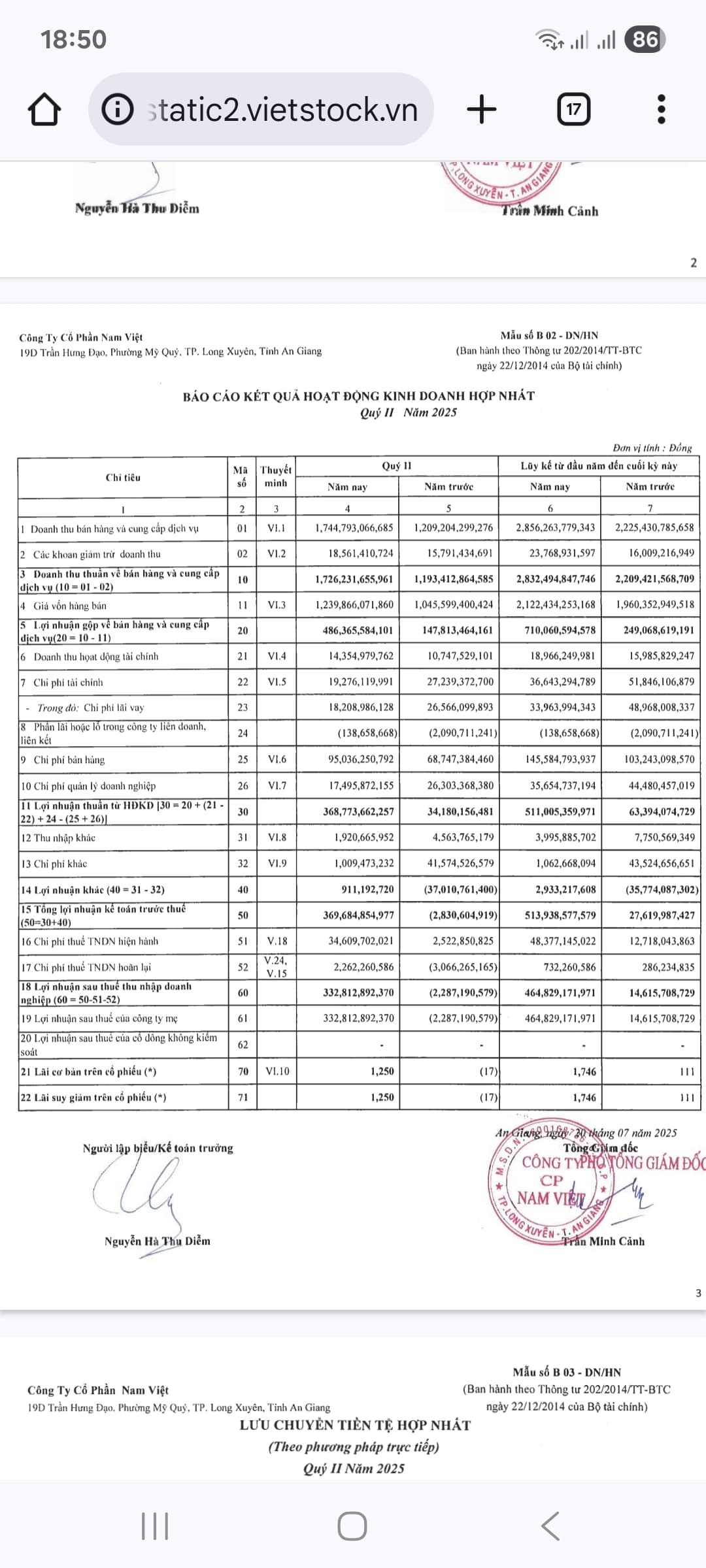 ANV ghi nhận doanh thu 2.000 tỷ đồng (+49% YoY) nhờ xuất khẩu cá tra phục hồi và giá bán tăng tại các thị trường Mỹ, Trung Quốc, EU. Giá vốn chỉ tăng 30%, giúp biên lợi nhuận gộp đạt 24,4% (so với 12,9% cùng kỳ), lợi nhuận gộp đạt 487 tỷ đồng (+183%) – mức cao nhất từ sau 2022.
