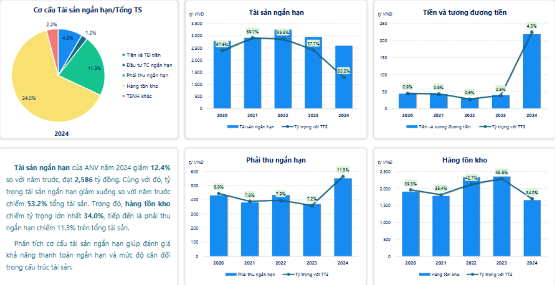 Tài sản ngắn hạn của ANV năm 2024 giảm 12.4% so với năm trước, đạt 2,586 tỷ đồng. Cùng với đó, tỷ trọng tài sản ngắn hạn giảm xuống so với năm trước chiếm 53.2% tổng tài sản. Trong đó, hàng tồn kho chiếm tỷ trọng lớn nhất 34.0%, tiếp đến là phải thu ngắn hạn chiếm 11.3% trên tổng tài sản.