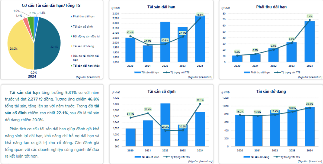 Tài sản dài hạn tăng trưởng 5.31% so với năm trước và đạt 2,277 tỷ đồng. Tương ứng chiếm 46.8% tổng tài sản, tăng lên so với năm trước. Trong đó tài sản cố định chiếm cao nhất 22.1%, sau đó là tài sản dở dang chiếm 20.0%.