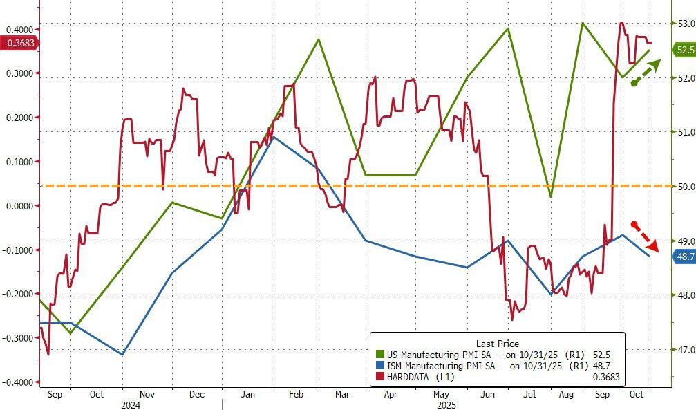 Sự chênh lệch giữa hai chỉ số sản xuất chủ chốt đã cho thấy thách thức lớn trong việc đọc vị bức tranh kinh tế hiện nay. Chỉ số S&P Global US Manufacturing PMI tháng 10 tăng lên 52,5, cao hơn dự báo (52,2) và duy trì ba tháng liên tiếp trên ngưỡng 50 – ranh giới phân định giữa mở rộng và thu hẹp. Diễn biến tích cực này, tương đồng với kết quả khả quan tại châu Âu, Brazil và Canada, gợi mở về sự cải thiện đáng kể trong hoạt động sản xuất, nhờ tăng trưởng mạnh ở cả sản lượng lẫn đơn hàng mới.