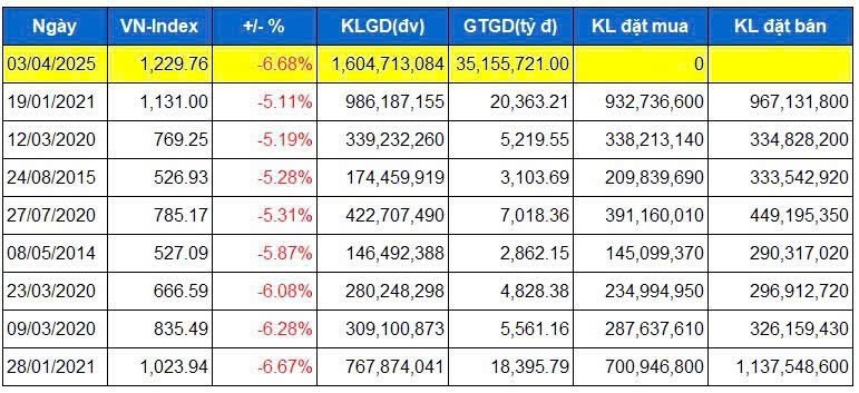 Phiên giao dịch ngày 3/4/2025, thị trường chứng khoán Việt Nam đã chứng kiến phiên giảm điểm kỷ lục từ trước đến nay. Cụ thể, chỉ số Vnindex giảm hơn 88 điểm, tương ứng 6.68%, đây được coi là mức giảm sàn của cả thị trường chung.
