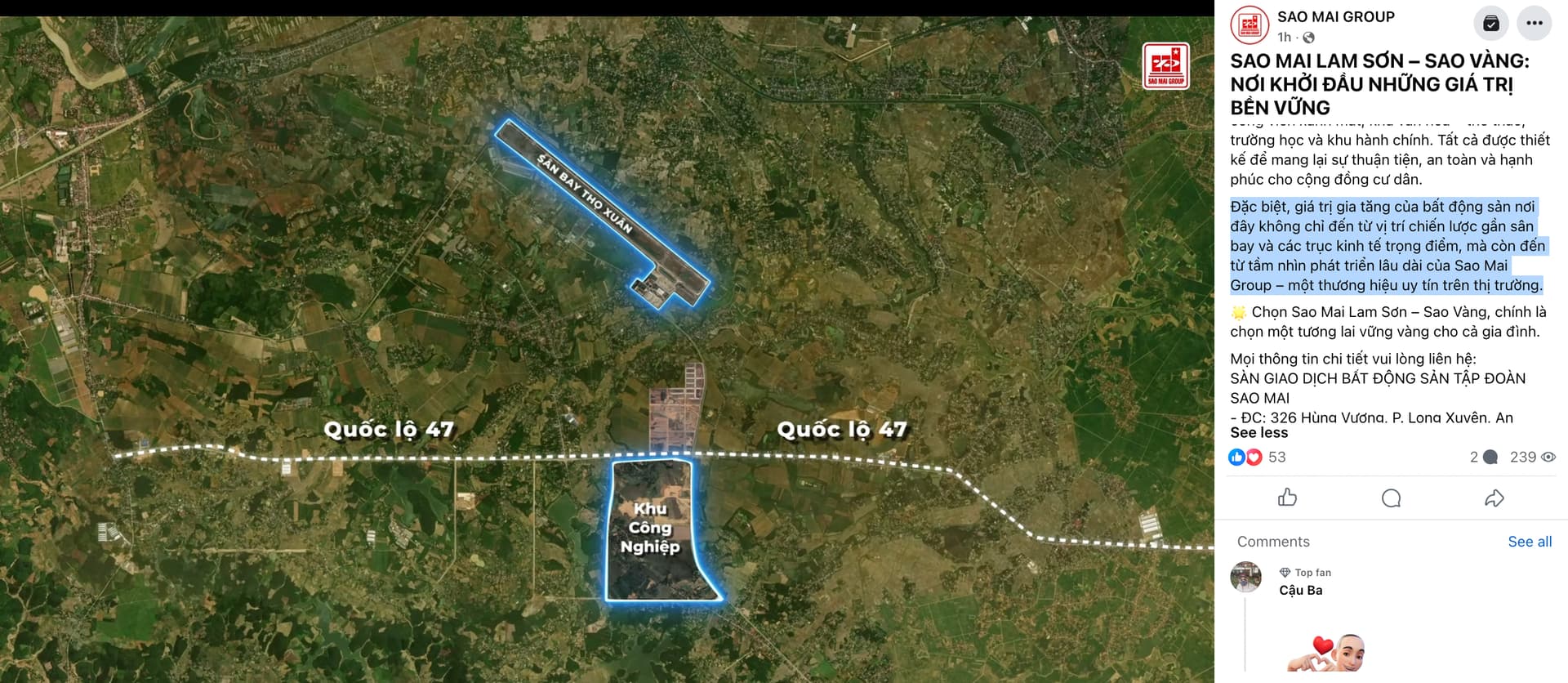 Tiếp giáp sân bay Thọ Xuân Thanh Hóa, đối diện là KCN lớn, mặt tiền đường Quốc lộ 47. CĐT nhá hàng mở bán cuối tháng 5/2025 trên fanpage nhưng tới giờ vẫn im bặt, đoạn này thấy rục rịch đăng lại nhiều chắc sắp có động thái tích cực. Mới mở mua coi như tiết kiệm được 4 tháng chờ đợi.