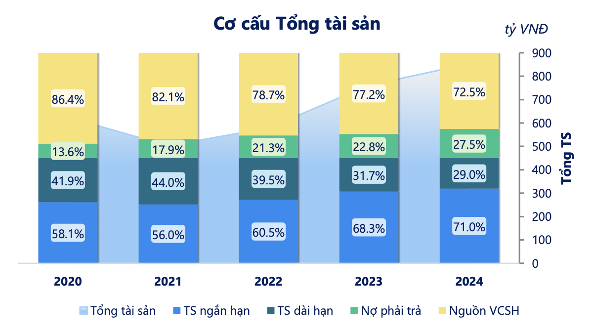 - Tài sản ngắn hạn chiếm 71,0% tổng tài sản, tăng từ mức 68,3% năm 2023. Tăng trưởng mạnh nhất đến từ đầu tư tài chính ngắn hạn (34,8%) và tiền & tương đương tiền (15,8%), cho thấy công ty có dự trữ tiền mặt tốt và quản lý dòng tiền hiệu quả.