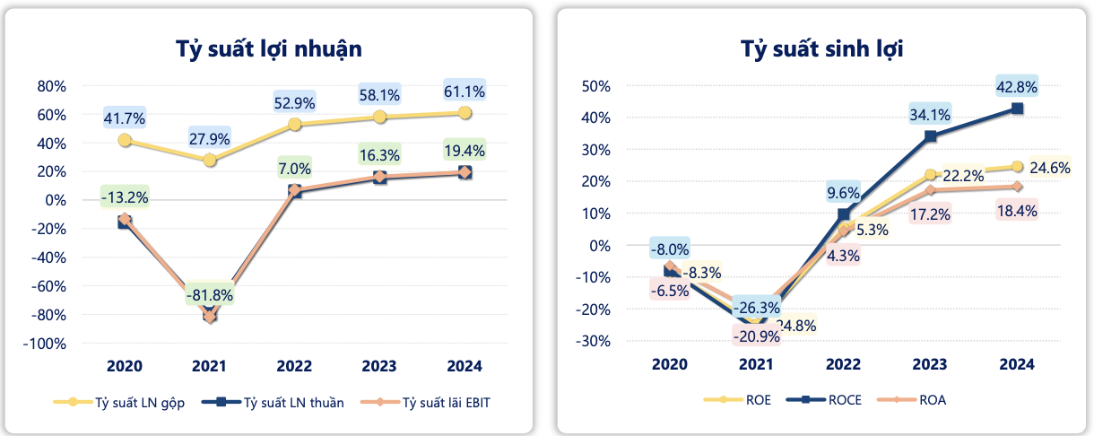 đồng, lần lượt tăng 20.9% và tăng 34.4% so với năm trước. Quý 4/2024 đạt doanh thu 351 tỷ vượt mức cùng kỳ quý trước 21% và vượt mức cao nhất trước dịch Q3/2019 là 300 tỷ. Biên EBIT tăng từ 14.3% lên 18.46% dự kiến năm 2025 biên EBIT sẽ tăng vượt mức năm 2019 là 20%. ROE 28.81% đạt mức cao nhất trong vòng 5 năm.