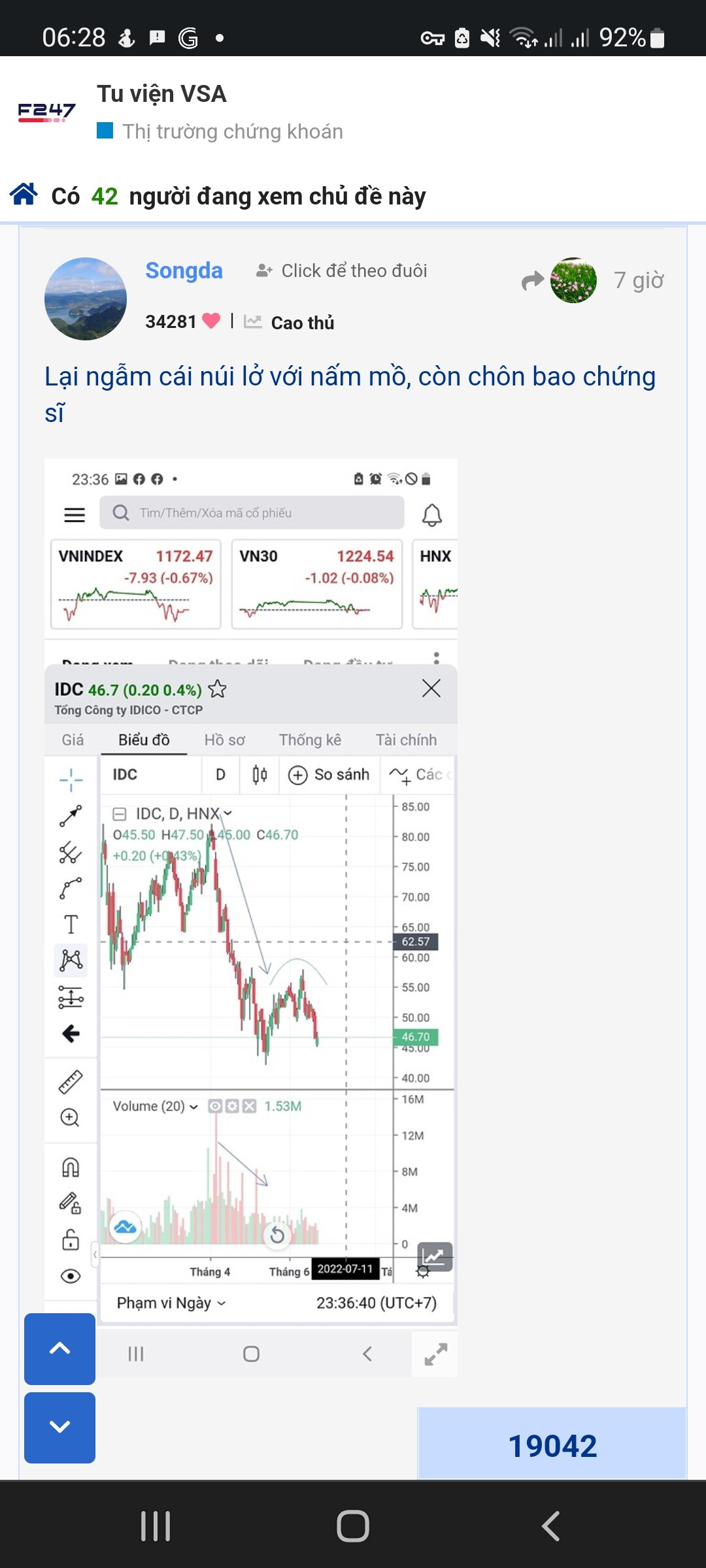 Hành động cho ngày 23/6: còn tiền thì canh giảm mạnh mua, để lúc xanh mạnh còn có cái mà bán. Ngược lại, nếu nó tăng thì nằm im cho nó hiếp để mà về bờ. Các nhà đầu tư cần chuẩn bị tinh thần cho 49-53 kịch bản đã đưa ra trong Rum.