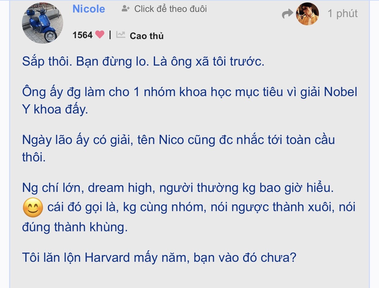 Đệch trên f này h còn có cả người sắp có nô ben y khoa nữa cơ à, lại còn công dân toàn cầu ưu tú nữa cơ thài, ảo nhỉ