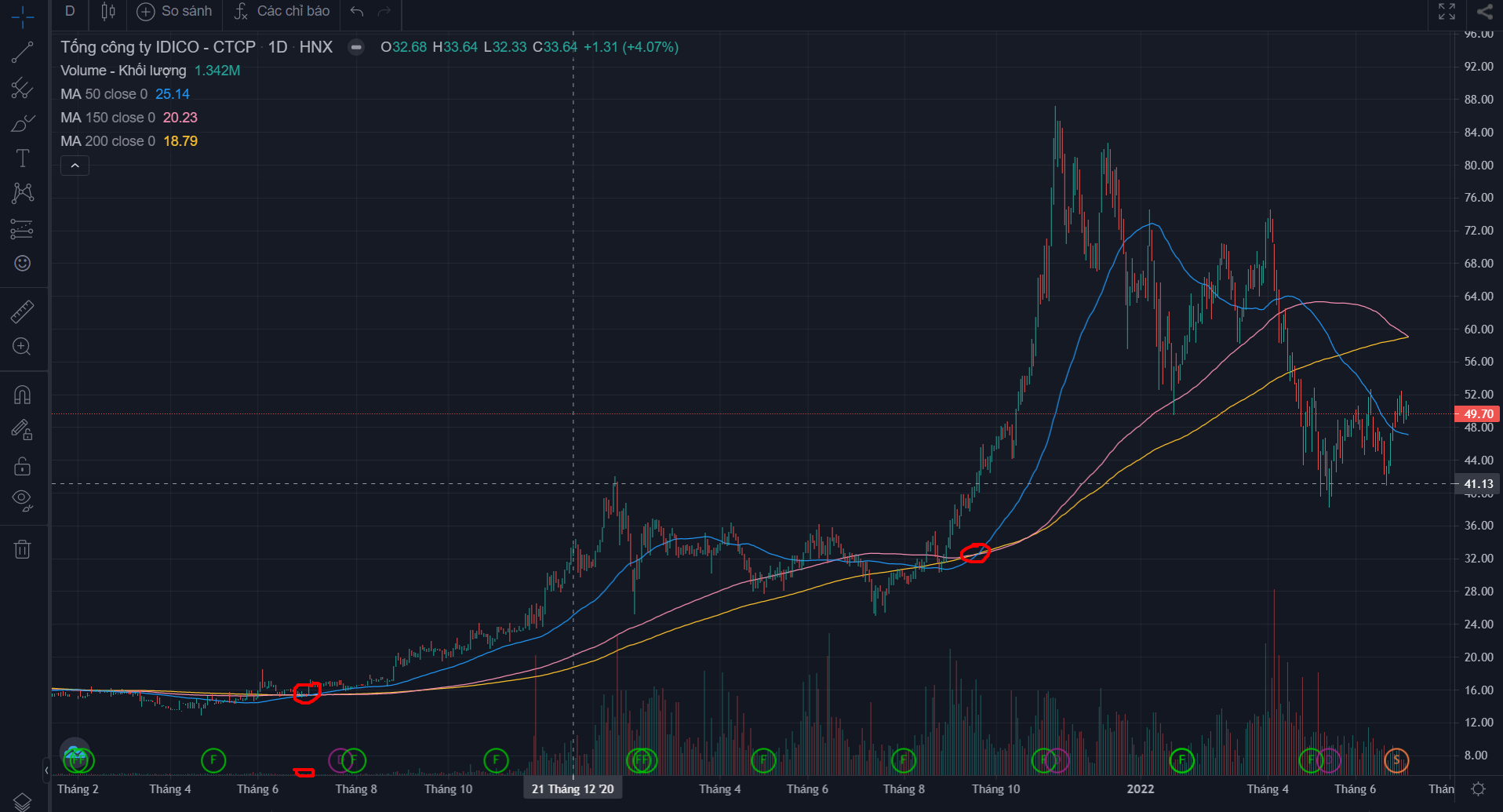 tại chân sóng tăng giá thì giá cp lúc đó phải cao hơn MA50, MA50 phải cao hơn MA150 và MA150 thì cao hơn MA200