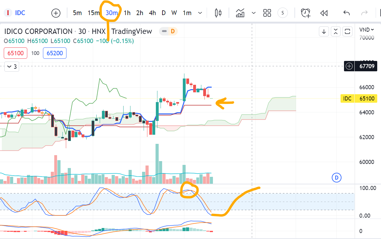 Chart 30m - đã qua mây, còn trên đường baseline (màu đỏ) → ok