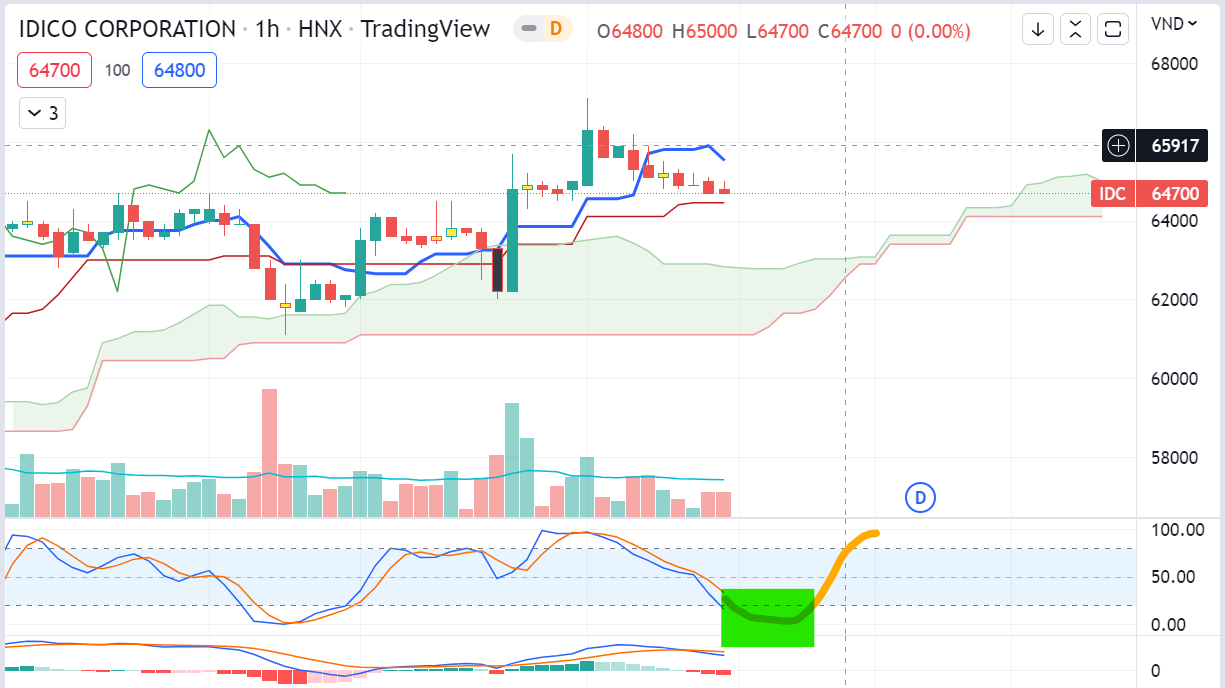 Chart 1h → stochastic đang xuống, chưa chạm đáy → còn phải rung lắc thêm chút nữa