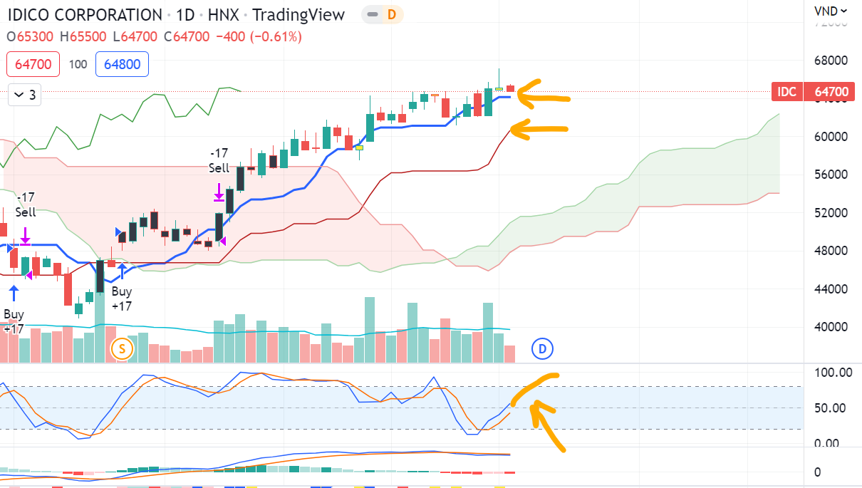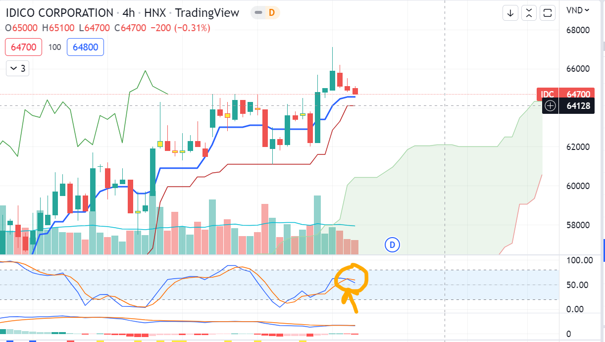 Chart 4H. Stochastic đang lên, có cắt xuống → hơi xấu. Nhưng vẫn trên conversion line → ok, canh tiếp