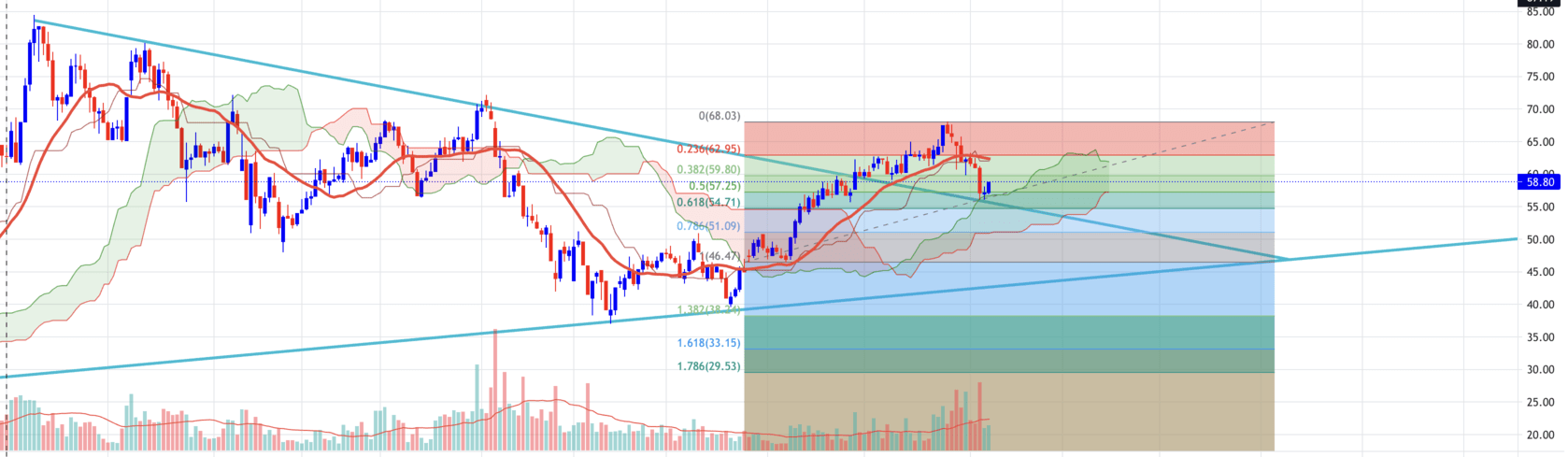 - Vừa rồi điều chỉnh về vùng bắt đầu phá vỡ (55-57) , theo tích cực có thể gọi là test lại để đi lên theo trend tăng cứng cáp hơn . Cũng là lúc về vùng fibo hỗ trợ ngắn hạn 0.5 nếu tính đáy ngắn hạn trước là giá 46,5k .