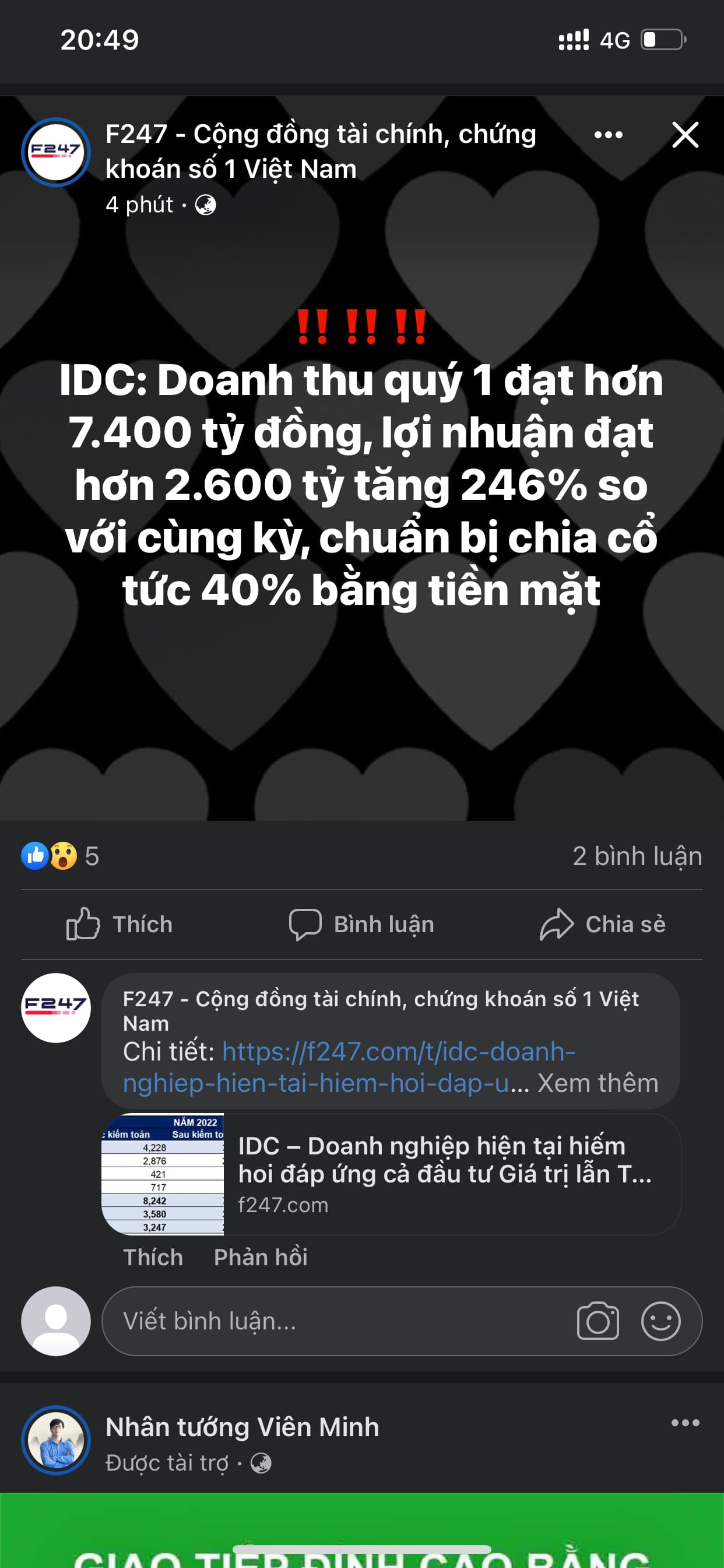 IDC: Doanh thu quý 1 đạt hơn 7.400 tỷ đồng, lợi nhuận đạt hơn 2.600 tỷ tăng 246% so với cùng kỳ, chuẩn bị chia cổ tức 40% bằng tiền mặt