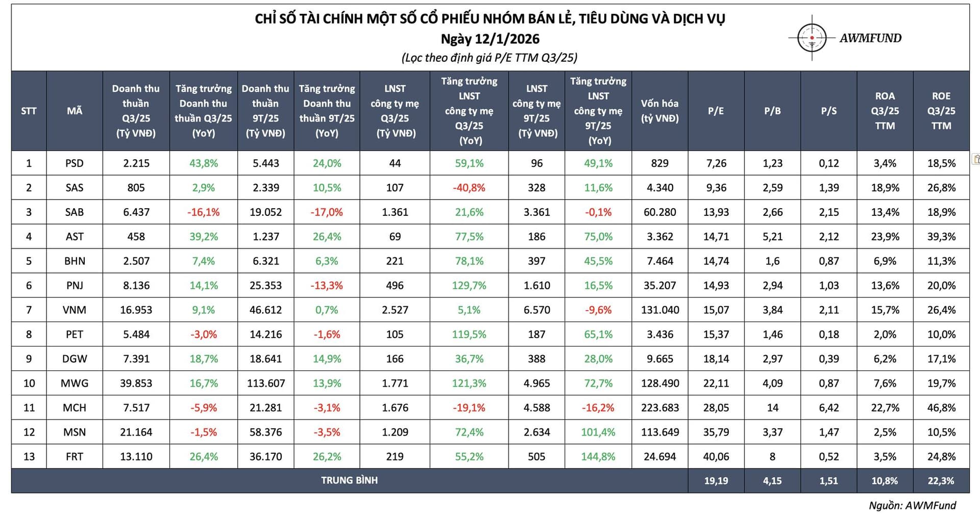 Ngành phân phối bán lẻ đang dần trở nên đắt đỏ hơn bao giờ hết với PE trung bình ngành đã lên mức trên 21,2x lần. Tăng trưởng Q3 siêu mạnh mẽ và Q4 dự báo sẽ vẫn lạc quan khi bước vào 2026 được dự báo là tiếp tục bùng nổ tăng trưởng.