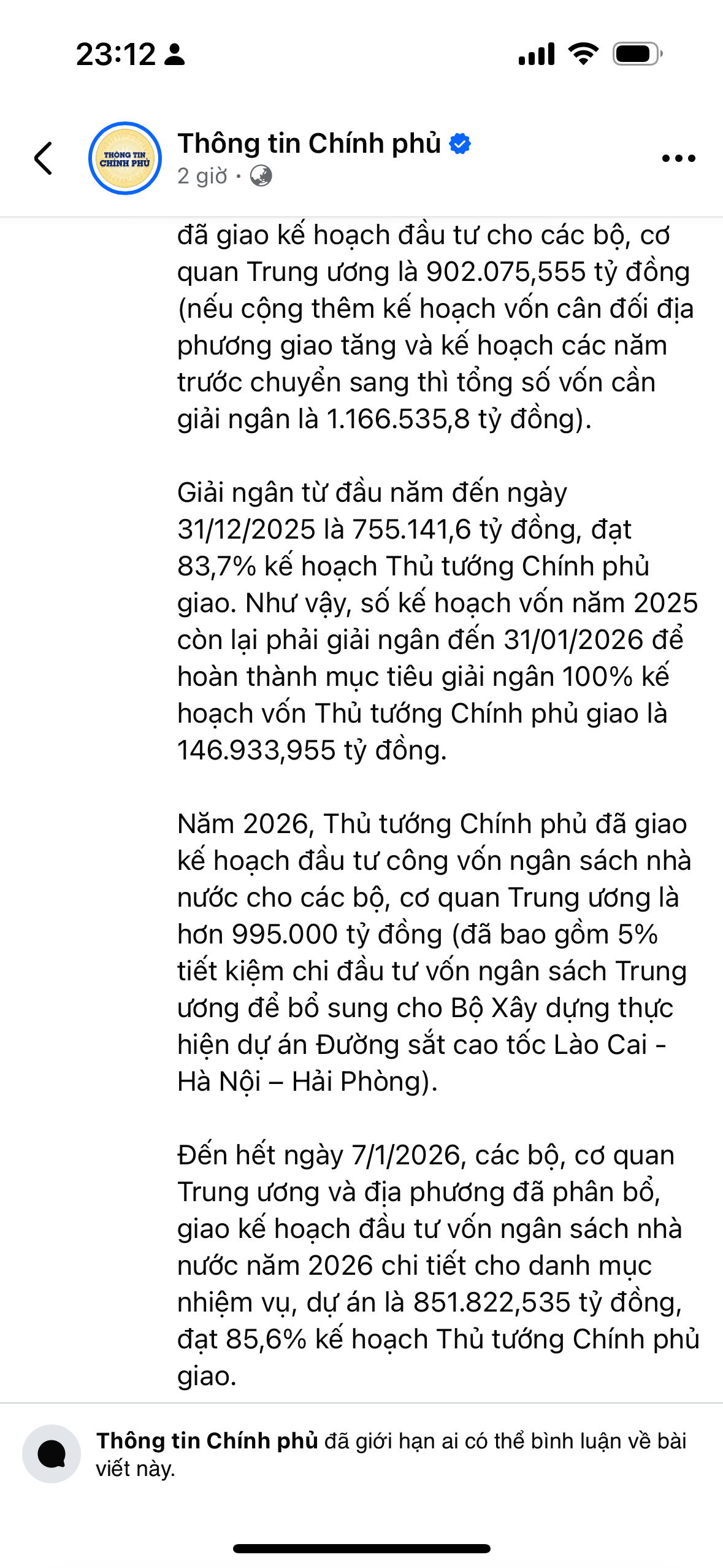 “Yêu cầu thúc đẩy giải ngân vốn đầu tư công góp phần tăng trưởng hai chữ số năm 2026”, Thủ tướng nói, thêm rằng giải ngân đầu tư công là một tiêu chí để đánh giá xếp loại chất lượng tập thể, cá nhân trong hệ thống chính trị.
