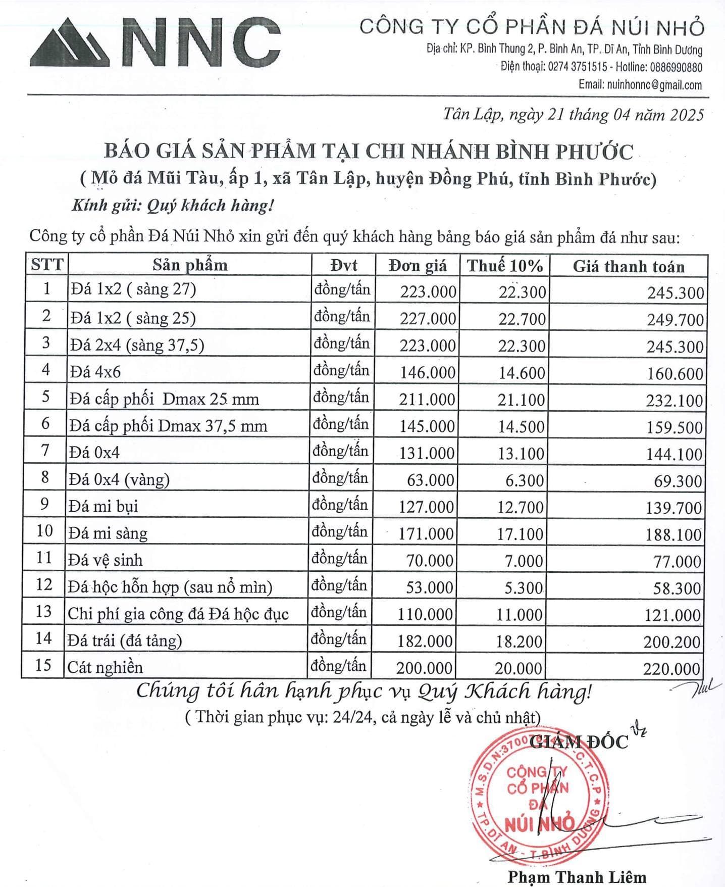 GIÁ BÁN ĐÁ TẠI CÁC MỎ NNC - MVC