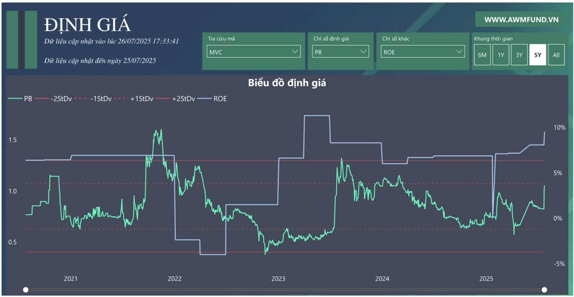 Chúng tôi kỳ vọng 2H2025 MVC sẽ còn tiếp tục tăng trưởng vượt trội như trong Quý 2/2025 với lợi nhuận ròng đạt 50 tỷ mỗi quý. Cùng với việc NNC chắc chắn vượt đỉnh thì khả năng cao tổng lợi nhuận kế toán của MVC cho 2025 có thể đạt 248.6 tỷ đồng, một kỷ lục vô tiền khoáng hậu của doanh nghiệp này. ROEA đạt 20%. Với giá quanh bookvalue, upside hiện lên rất rõ ràng với vốn hoá mục tiêu trên 2.000 tỷ đồng, + 48% từ vùng giá 13.500 đồng.