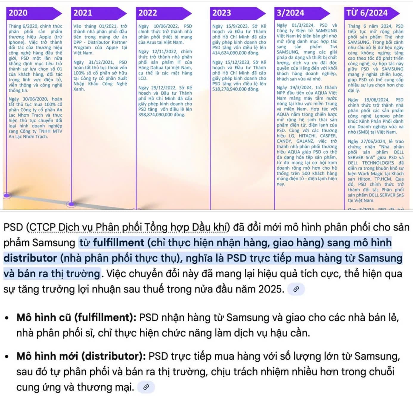 Tuy nhiên, kể từ năm 2025, Samsung đã chuyển sang mô hình phân phối (distributor) thực thụ. Theo đó, PSD sẽ trực tiếp mua hàng từ Samsung và bán ra thị trường. Điều này giúp biên lợi nhuận cải thiện rõ rệt, nhưng đồng thời cũng đòi hỏi mức độ đầu tư lớn hơn, cả về hệ thống và nguồn lực bán hàng.
