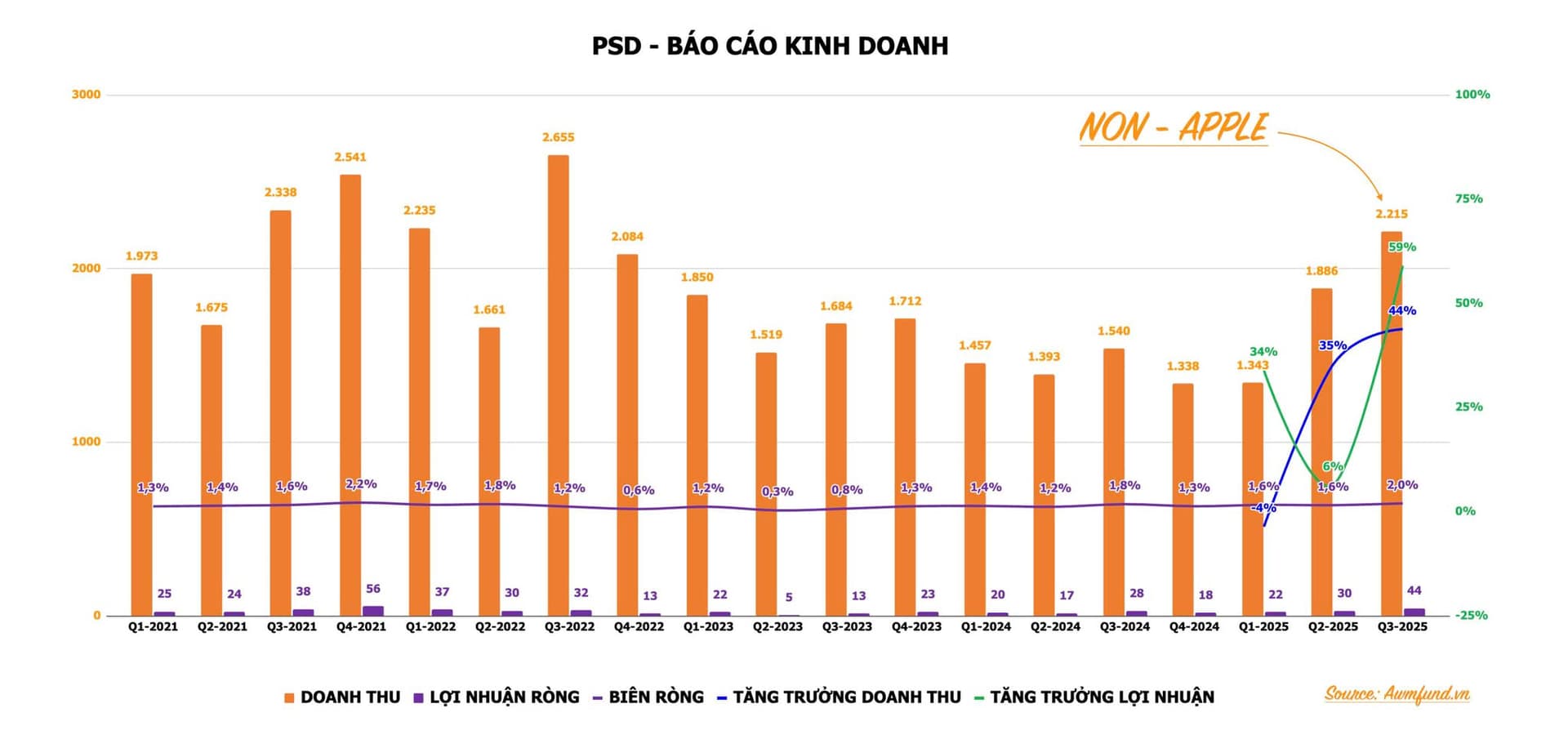 Ông Vũ Tiến Dương, tân Chủ tịch HĐQT PSD (được bổ nhiệm tại đại hội sau khi ông Trần Quang Huy xin từ nhiệm) thông tin, trong quý I/2025, Công ty ghi nhận doanh thu đạt khoảng 1.400 tỷ đồng, tương ứng khoảng 20% so với kế hoạch cả năm; lợi nhuận đạt 28 tỷ đồng, tăng trưởng 7%. Thực tế, lợi nhuận 3 tháng đầu năm có thể đạt cao hơn, nhưng do Công ty đầu tư khá là nhiều cho cái đội ngũ của Samsung để chuyển đổi mô hình khiến lợi nhuận chưa tăng trưởng mạnh.