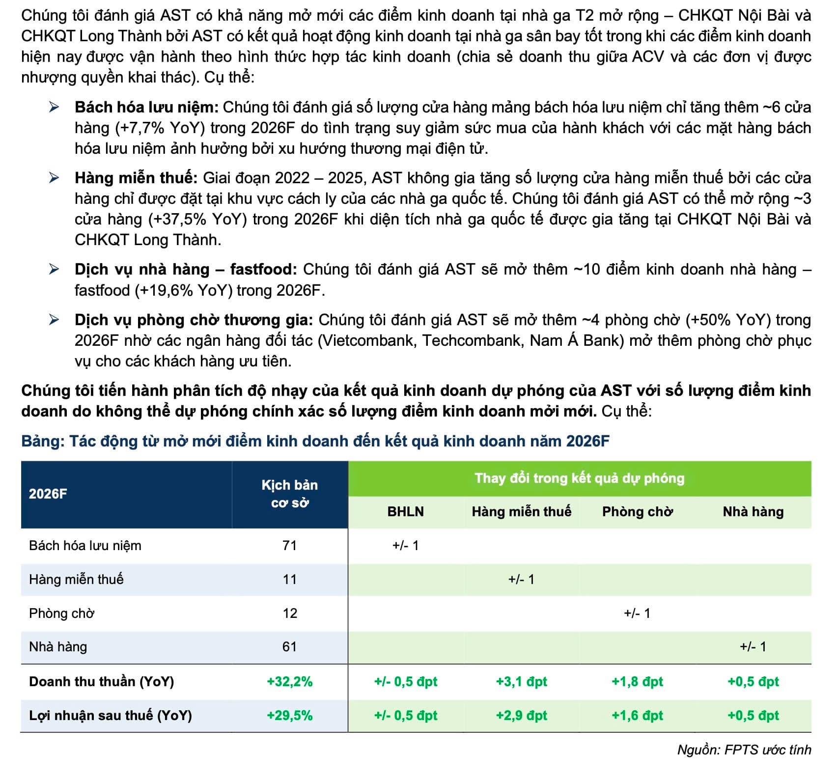 ➢ Doanh thu/điểm kinh doanh gia tăng nhờ triển vọng ngành du lịch tích cực: Chúng tôi dự phóng doanh thu/điểm kinh doanh của AST mảng bách hóa lưu niệm, hàng miễn thuế, nhà hàng – fastfood và phòng chờ thương gia lần lượt tăng +4,2% YoY, +10,5% YoY, +6,0% YoY và +9,5% YoY.