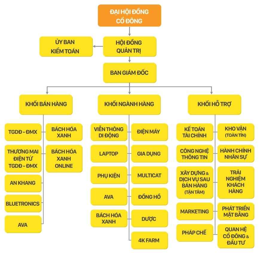 - MWG sở hữu chuỗi bán lẻ ĐTDĐ và điện máy hàng đầu tại Việt Nam với thị phần năm 2022 lần lượt là 60% và 50%. Để duy trì tăng trưởng mạnh trong dài hạn, MWG đã triển khai chuỗi bách hóa mini là Bách Hóa Xanh với thị phần 20% đến năm 2022.