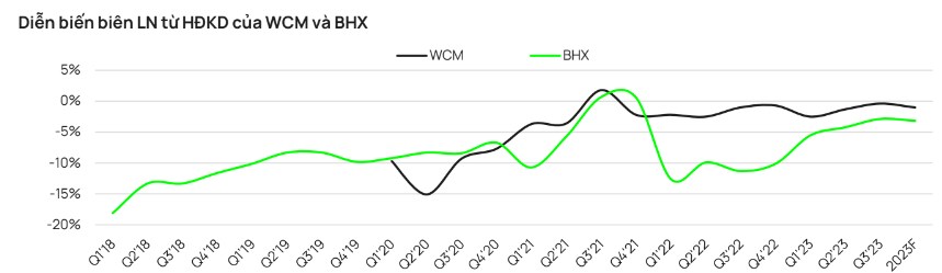 Theo ước tính, doanh số bán hàng trực tiếp của BHX đã tăng 36% từ quý 1 đến quý 3/2023, trong khi chi phí SG&A tăng 17%. Trong BCKQKD Q4 vừa được công bố, Doanh số/cửa hàng của BHX đã cải thiện 20% từ tháng 6 đến tháng 12. Đặc biệt, Doanh thu/cửa hàng của BHX đạt khoảng 1,82 tỷ đồng trong tháng 12, tăng nhẹ từ khoảng 1,75 tỷ đồng vào tháng 11/2023. Do đó, doanh số sản phẩm tươi sống cải thiện (~38% tổng doanh số) đi kèm với chi phí logistic và khuyến mãi gia tăng, đồng thời biên LNHĐ của BHX cải thiện 150 điểm phần trăm so với quý trước, đạt âm 1.4% trong quý 4/2023.