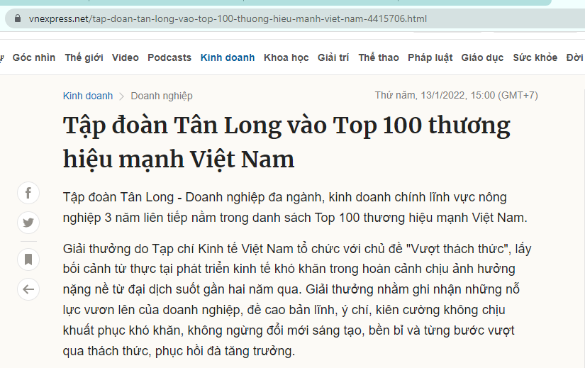 Vị thế: Tân Long thuộc top 1 nhà cung cấp nguyên liệu thức ăn chăn nuôi tại thị trường Việt Nam đồng thời cũng là DN thành công trong lĩnh vực lúa gạo chăn nuôi và điều. Thuộc vào top 100 thương hiệu mạnh nhất Việt Nam