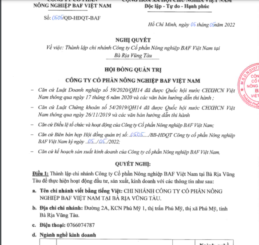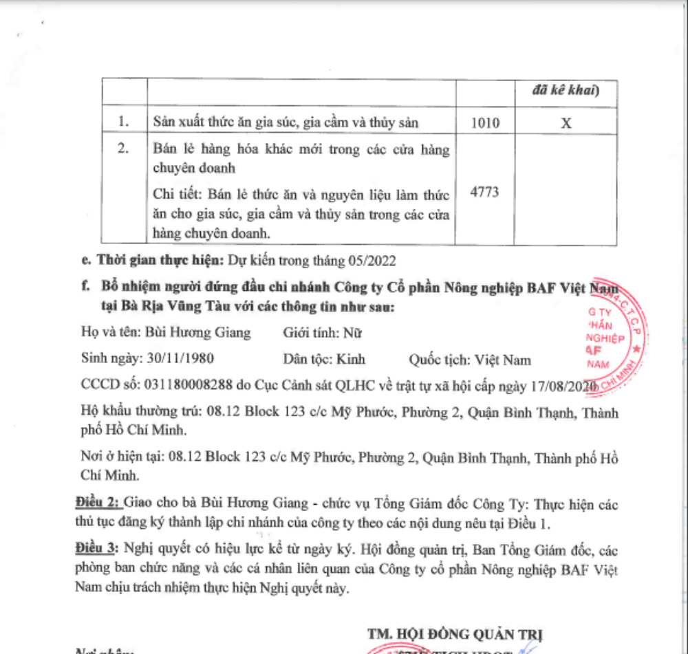 **Ngày 5/5 BAF thành lập chi nhánh thứ 3 tại Vũng Tàu: i nghiêp vụ sản xuất thức ăn chăn nuôi, và bán các sản phẩm liên quan trong các cửa hàng liên doanh của mình.
