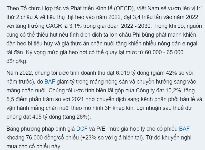Đang tích lũy mà bác nhỉ, đoạn này chờ kết quả kinh doanh quý 1 chắc là chạy. Quý này giá thức ăn chăn nuôi tăng ảnh hưởng chung đến đầu vào của toàn ngành nhưng BAF lại có lợi thế đầu vào từ Tân Long, cộng thêm bên Siba Food đang mở rộng của hàng, thấy bảo nguồn cung của BAF đang ít hơn so với lượng hàng tiêu thụ của Siba. Dự là quý 1 doanh thu chăn nuôi đâu đó cũng quanh 800 tỷ
