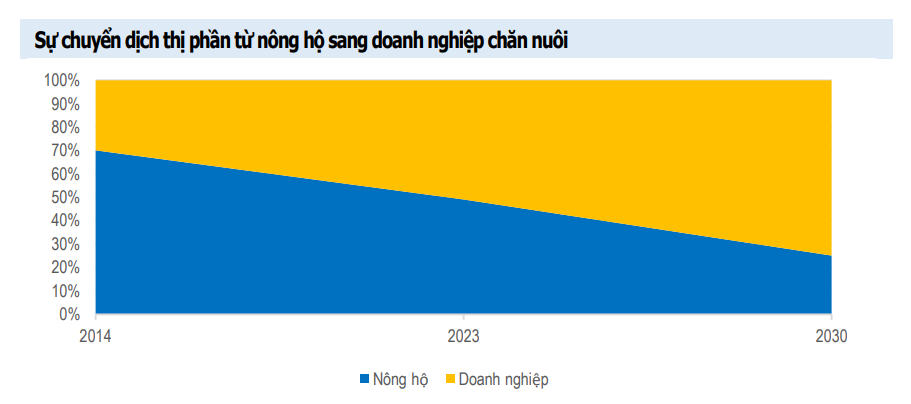 Thực tế cũng cho thấy cơ cấu ngành chăn nuôi đang dịch chuyển về phía các doanh nghiệp khi thị phần của khối nông hộ ngày càng thu hẹp, đặc biệt là sau biến cố dịch tả heo châu Phi (ASF) và đại dịch COVID-19. Ước tính thị phần nông hộ đã giảm mạnh trong mười năm trở lại đây, thu hẹp đáng kể từ 70% vào năm 2014 xuống còn 49% vào năm 2023 và dự kiến sẽ chỉ còn chiếm tỷ trọng 25% trong năm 2030.