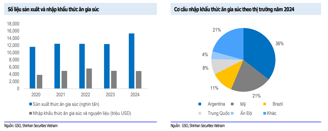 - Ngành chăn nuôi Việt Nam vẫn chưa thể tự chủ hoàn toàn được nguồn nguyên liệu đầu vào và vẫn phụ thuộc vào nguồn nhập khẩu thức ăn chăn nuôi và nguyên liệu như ngô hạt, đậu tương, đạm động vật, bột xương… Năm 2024, cả nước sản xuất được hơn 15.3 triệu tấn thức ăn gia súc, bên cạnh đó cũng nhập khẩu 4.9 triệu USD thức ăn gia súc và nguyên phụ liệu. Các thị trường nhập khẩu chính là Argentina, Mỹ, Brazil…