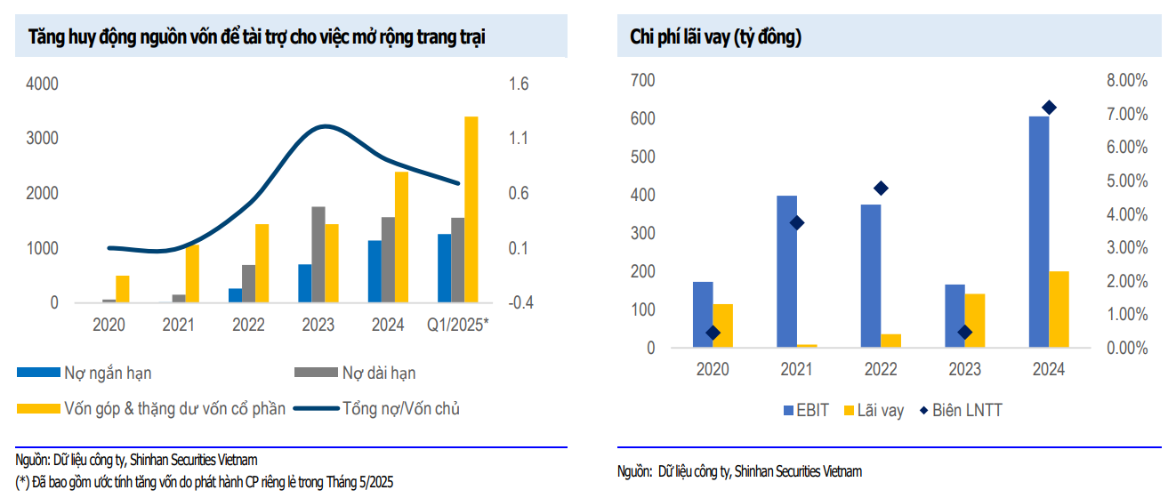 Để tài trợ cho các hoạt động mở rộng quy mô trang trại và đàn heo, BAF đã tăng mạnh quy mô vay nợ cũng như tiến hành các hoạt động tăng vốn. Tổng nợ ngắn hạn và nợ dài hạn tăng mạnh trong giai đoạn 2020-2024, khiến tỷ lệ Nợ/Vốn chủ cũng tăng mạnh lên mức 0.9 vào năm 2024.